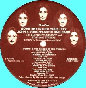 The tracks deal with the imprisonment of communist Angela Davies ("Angela"); John Sinclair ("John Sinclair"); the Attica State prison shooting and northern Ireland violence ("Attica State" and "Sunday Bloody Sunday"); the problems in Northern Ireland ("Luck of the Irish"); the subjugation of women ("Woman is the N***** of the World"); and of course John's own recent personal adventures, which he always assumed would interest his fans ("New York City"). Yoko's contributions included a feminist anthemn ("Sisters Oh Sisters") and an oddly-phrased plea for universal oneness ("We're All Water"). A companion disk was included featuring J&Y jamming live with Frank Zappa, making "ST" a double-album. As previously noted, the critics savaged it. John's fans didn't care for it, either; it was the poorest-selling of all John's solo attempts. The single, "Woman is the N*****r of the World", was equally a flop, failing to chart in the top 20. (Interestingly, the single from "POB", "Mother", sold equally poorly, although "POB" itself cracked the top ten.) John even said himself that the tracks were "garbage", as he'd just "stick his head out the window to see what everyone was saying", instead of concentrating on his personal feelings and impressions, as on "POB" and "Imagine". Retrospect shows that this began a two-year lull for John, as his personal life disintegrated and he produced generally mediocre (or worse) records. Even his excellent anti-war single, "Happy Xmas", was a commercial disaster: released in December '72, it was introduced into stores too close to Xmas to generate sales. Since his murder, "Happy Xmas" has become (arguably) rock's premier Xmas tune, in power with "Give Peace a Chance" and "Imagine" as John's best-loved songs; but 25 years ago, it represented yet another missed opportunity.